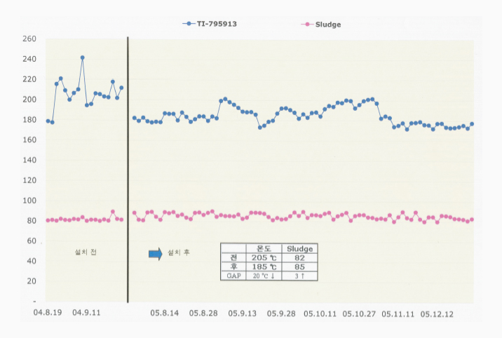 J사는 유동층 보일러를 보유하고 있으며 시계열적으로 Evaporator의 증발 효율이 감소되는 현상이 발생되고 있었습니다.Sonic Horn 설치 후 Evaporation Ratio가 약 0.2% 상승하는 효과를 보았습니다.
